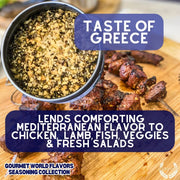 Taste of Greece: California Sea Salt, Garlic Powder, Black Pepper, Oregano, Lemon Oil, Marjoram.