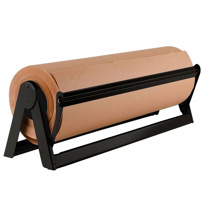 Made of sturdy steel with a matte black powder coated finish, this paper cutter is durable enough for daily, heavy-duty use. It's designed to hold a roll up to 9" in diameter with a 3" core and is easy to set up. Once a roll is installed, you can pull out the desired amount of product and quickly tear it against the safe, straight-edge, spring-loaded blade, eliminating the need for scissors and a ruler. When you're ready to change the roll, the blade arm can be locked into the open position, allowing you to slide the dowel out of the sockets and replace the roll.Â
