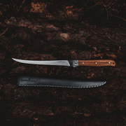 The Bushcraft Fillet Knife. With its long, razor-sharp blade that is both strong and flexible, this high-quality tool is perfect for wild seafood adventures and precision cutting. Its sleek wooden handle is ergonomically designed for a comfortable and firm grip, while the reinforced leather sheath ensures safe and easy transport.