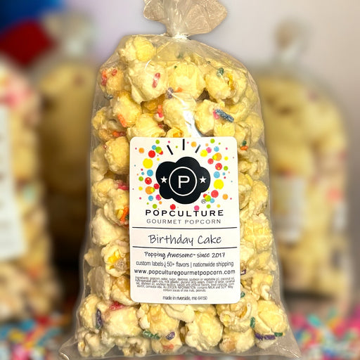 Popculture Gourmet PopcornRidiculously delicious vanilla popcorn coated in white chocolate “frosting” with sprinkles. Color palate: white, confetti