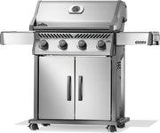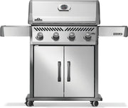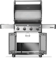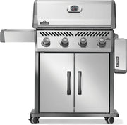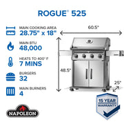 The sleek Napoleon Rogue® 525 Propane or Natural Gas Grill in stainless steel is a stylish upgrade for your outdoor living space. Achieve the best sear marks with our Wave cast iron grids. Four stainless steel burners ensure precise temperature control, while dual-level sear plates intensify flavors by vaporizing drippings. With 525 square inches of grilling space, create mouthwatering meals for any occasion. The easy-to-maintain porcelainized lid and powder-coated body seamlessly blend with your outdoor decor. Maneuver with ease using locking casters, and save space with folding stainless steel side shelves. Experience unmatched versatility, quality, and affordability with this Napoleon Rogue® Gas Grill.