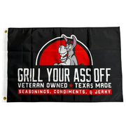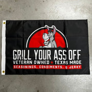 This 2x3 foot flag proudly displays the iconic Grill Your Ass Off logo, alongside the text "Veteran-owned Texas Made." Made with both indoor and outdoor use in mind, this durable flag is constructed with high-quality materials that are designed to withstand the elements. The flag includes two grommets, making it easy to hang from a flagpole, wall, your mancave or any other suitable location. Showcasing a perfect blend of patriotism, culinary excellence, and veteran entrepreneurship, this flag is an ideal way to show your support for Grill Your Ass Off and everything it represents!