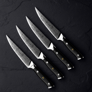 If you take your steak seriously, you need the right tools. Our new Steak Knife Set is forged from Japanese AUS-10 Damascus steel with 67 layers for incredible sharpness and stunning detail. Each knife is full tang, center balanced, and perfectly weighted for effortless control.