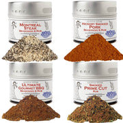 This gourmet BBQ master seasoning set is all you need for grilling season: 4 small-batch, all natural & non GMO spice blends, crafted in California and hand-packed unique magnetic tins that will stick to your grill, oven, fridge, or even car door!