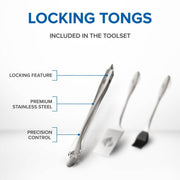 - Set includes easy to use locking tongs, a large and sturdy, multifunctional spatula, and a long handled, silicone basting brush